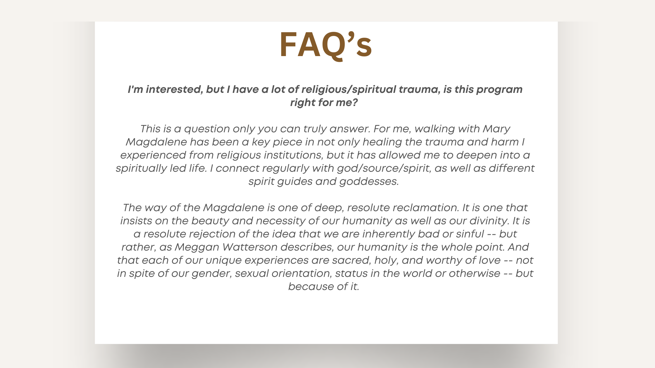 - bonuses include: full access to Hidden in Plain Sight, Easter, a Love Story, and the 4 Magdalene workshops